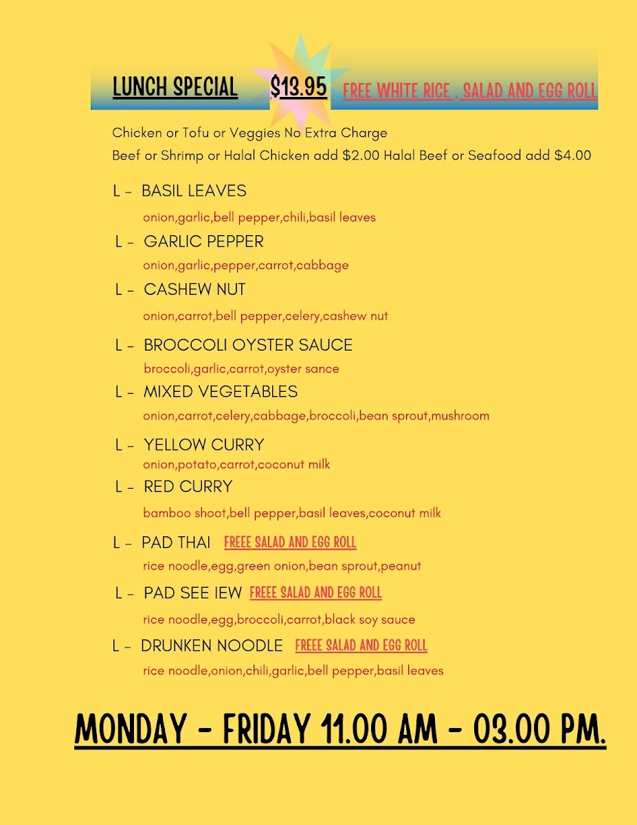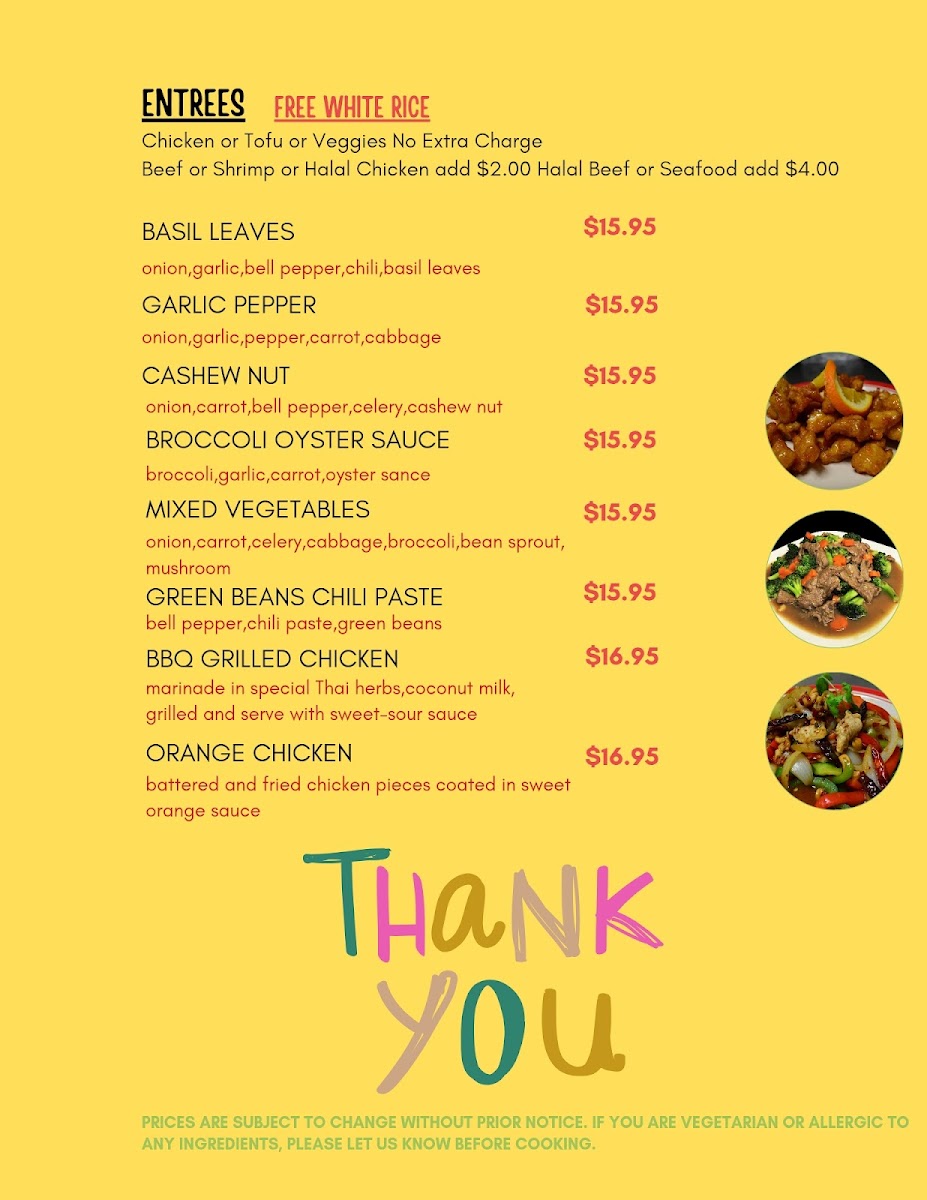Thai Thai Cuisine serves up a cornucopia of mouthwatering dishes that showcase the essence of Thai cooking. Start your meal with the Shrimp Papaya Salad, where the freshness of garlic, green beans, and lime juice intertwines brilliantly with juicy tomatoes and crunchy peanuts, creating an explosion of flavors. For those craving something heartier, the Green Curry is a customer favorite, simmered with bamboo shoots and fragrant basil leaves, bringing a perfect balance of spice and creaminess. Or perhaps indulge in the beloved Panang Curry, a rich concoction featuring bell pepper and coconut milk that is sure to take your taste buds on an unforgettable journey.