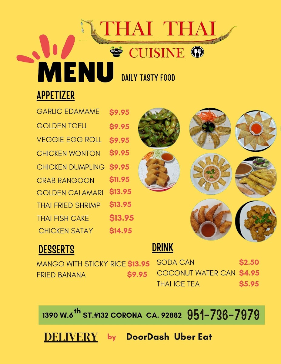 Welcome to Thai Thai Cuisine, the quintessential destination for Thai food lovers nestled in the heart of Corona, California. Located at 1390 W 6th St #132, this gem is a must-visit for anyone craving authentic Thai flavors paired with a warm, inviting atmosphere.